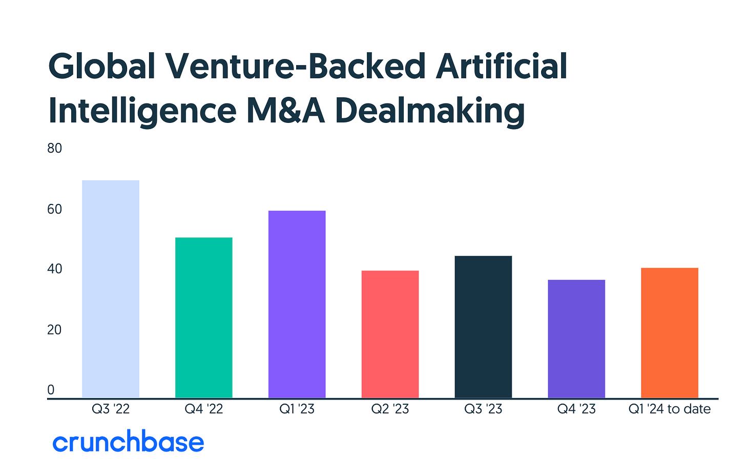 Venture Vibrance vs. M&A Mellow: AI startups enjoyed robust funding, but the expected M&A exit path lagged, with the slowest pace since Q1 2019 in the last quarter of 2023.